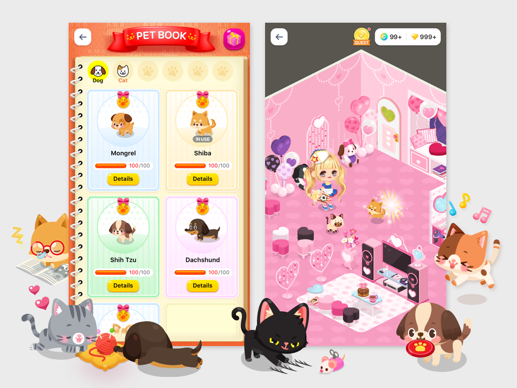 Adorable pets are now a part of LINE PLAY. Pets consist of a variety of 10 puppies and cats, which can be raised as pets in users' rooms. Each pet has their own favorite items which when placed in a user's room, will cause the pet to appear for a fixed amount of time. Users can cuddle a pet to raise its friendship level, receiving a present when its friendship level becomes full. Additionally, the pet will remain with the user as their very own permanent pet. Additional pets are planned for future updates.