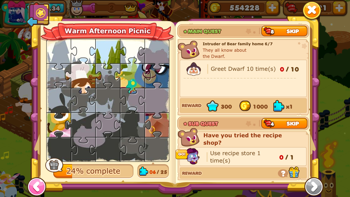 Another interesting aspect of the game is the quest feature. Players complete quests they receive from characters straight out of fairy tales in order to earn puzzle pieces. Collecting all the pieces completes a storybook, and the user is rewarded with an item or in-game currency they can use to help further their progress in the game.