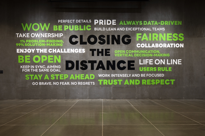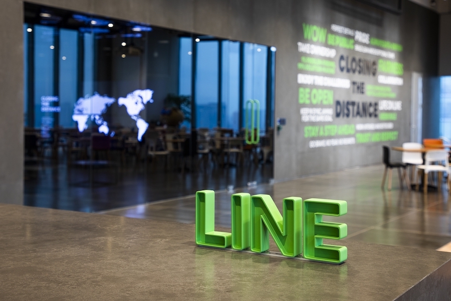 The walls are decorated with the keywords that represent LINE's developer culture — "Take Ownership," "Trust and Respect," and "Be Open" — along with other core concepts from LINE's unique culture.