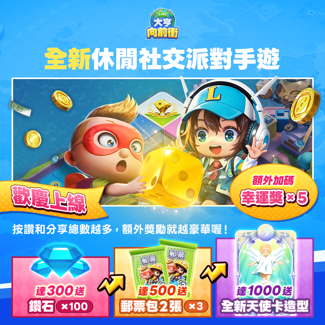 為慶祝遊戲正式上市,針對參與事前登錄活動的玩家將獲得特別的遊戲內獎勵。符合資格的玩家只需登入《LINE大亨向前衝》即可獲得。獎勵內容包含「骰子x 100+郵票包1張x 5+裝潢衝刺時刻30分鐘+金幣x 100,000+綜合召喚幣x 30+鑽石x 300+STAR點數x 100+免廣告特權卡(2日)」各種好禮!