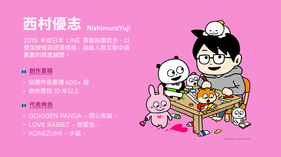 創造出「GOKIGEN PANDA - 開心熊貓 -」、「KONEZUMI - 小鼠 -」、「LOVE RABBIT - 戀愛兔 -」等超人氣角色的日本頂尖創作者西村優志,近日首度在台公開分享其創作心路歷程。西村老師的作品在 2025 年勇奪台灣貼圖排行榜第一名,面對如此亮眼的成績,他謙虛表示,這些貼圖最初是以日本市場為出發點構思,沒想到能獲得台灣用戶的熱烈喜愛,這也成為一個契機,讓他開始思考如何針對台灣市場的喜好,嘗試更多元風格的創作。