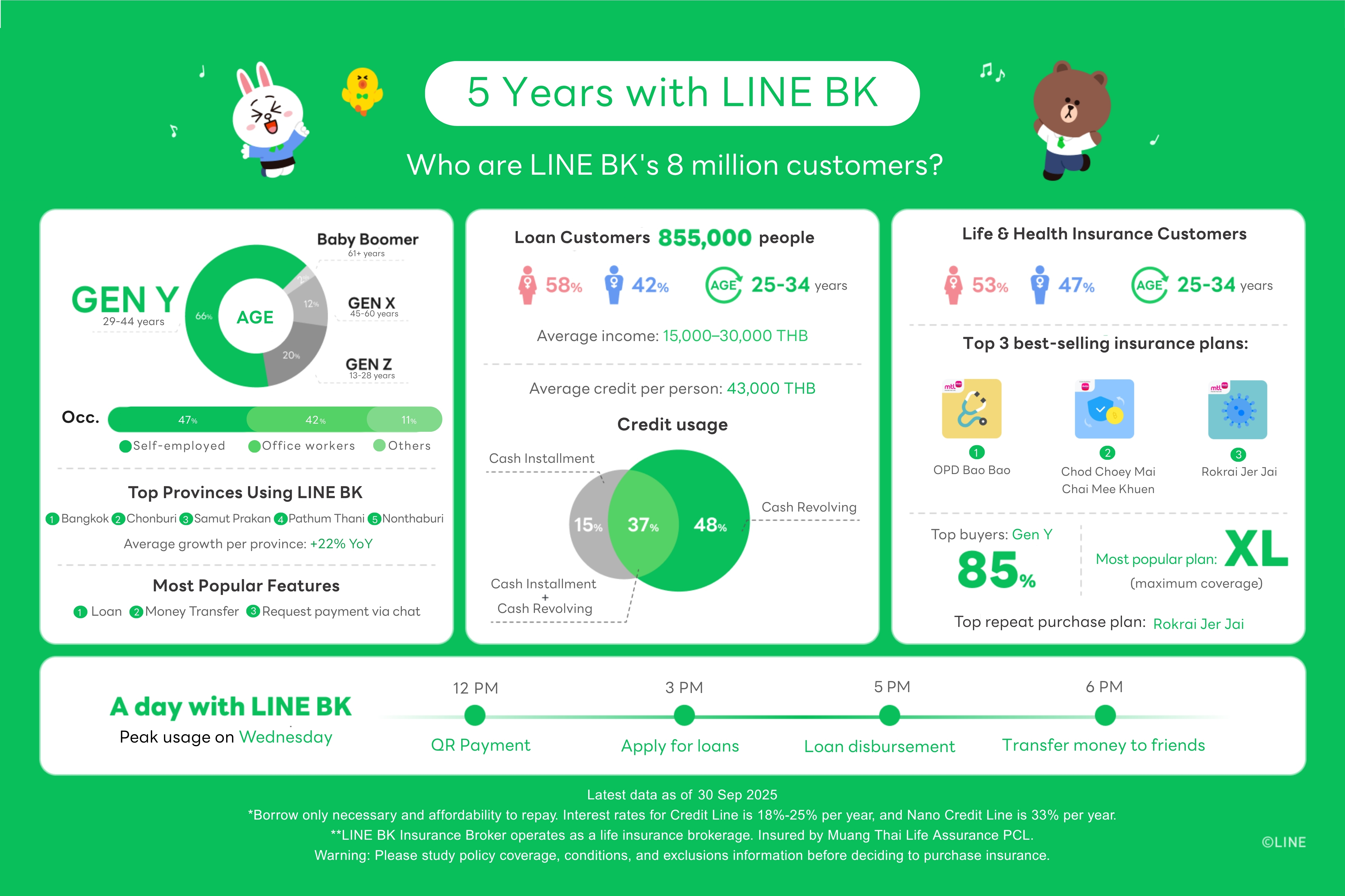 BANGKOK – October 23, 2025 – LINE BK celebrated five years of operations on Oct. 20, marking a half-decade as the pioneering “social banking” platform, integrating financial transactions — deposits, transfers, QR payment, loans, and insurance — within the LINE app.