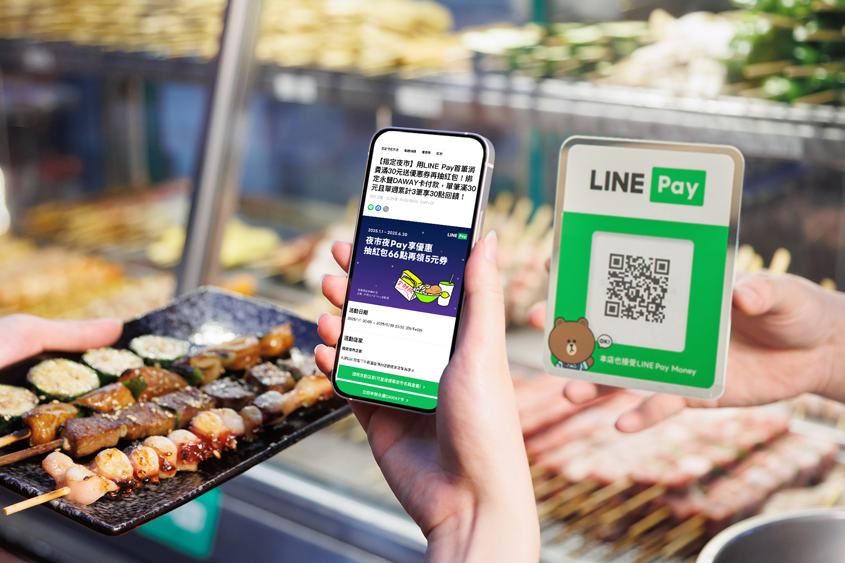 In Taiwan, QR payments are part of everyday life — in fact, 13.6 million of Taiwan’s 23 million people use LINE Pay — and LINE Pay sits at the center of that routine. You can find a green QR code sign with a cute Brown character on the counter of restaurants, grocery stores, cafes and even food stands. More than half of the population uses LINE Pay regularly, whether at large retail chains or small neighborhood shops.