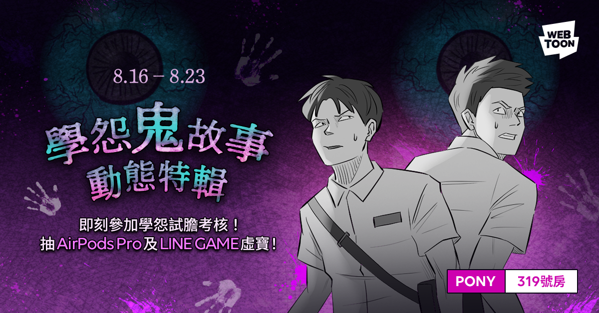 一年一度的鬼月來臨,網路漫畫平台LINE WEBTOON今夏再度祭出鬼月特輯,從8月15日起至8月22日,每晚10點更新一個話次,要陪伴所有讀者共度驚夏鬼月時光!說到鬼故事,每個校園都有自己的校園怪談,像是神秘的宿舍、夜晚中庭的雕像、堅守崗位的工友,還有絕對不要去的那一間廁所,校園題材的鬼話絕對是經典。LINE WEBTOON今年特別選定「校園鬼故事」為主題推出《學怨鬼故事・動態特輯》,邀請Pony、JUJU C.、璐奇以及竹川獅4位創作者,攜手將日常的校園風景打造為畫風驟變的詭譎場景,再利用動態畫面與靈異音效,讓讀者彷彿身歷其境、親身揭開藏在校園中的靈異面紗。