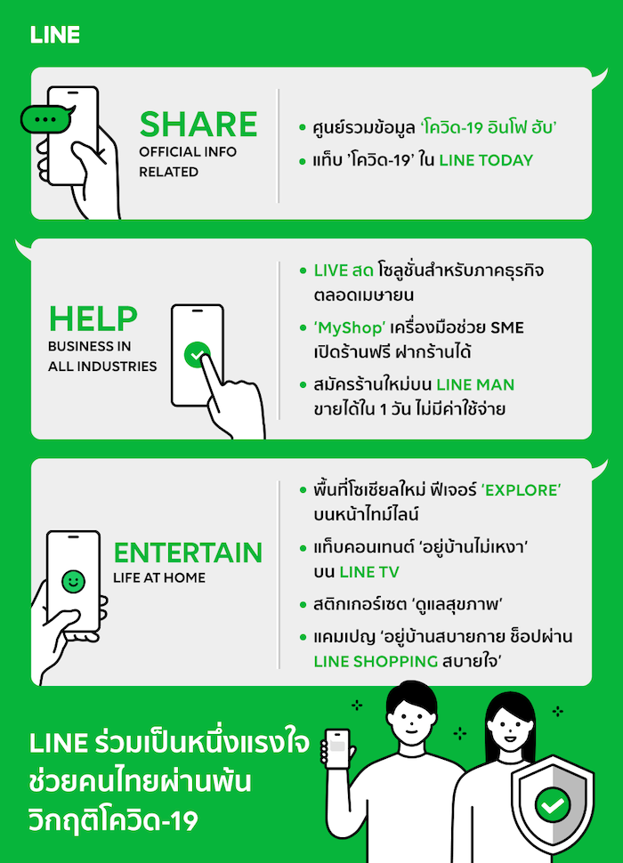LINE ประเทศไทย ภายใต้พันธกิจ “Closing the distance” เร่งเพิ่มการพัฒนาแพลตฟอร์มและโซลูชัน เพื่อส่งแรงใจช่วยคนไทยทั้งในระดับบุคคลและธุรกิจให้ปรับตัว ปรับแนวคิด สามารถพลิกวิกฤติให้เป็นโอกาสในสถานการณ์การระบาดของโควิด-19 โดยเฉพาะช่วง Social Distancing หรือ ‘การเว้นระยะห่างทางสังคม’ ผ่าน 3 มาตรการ ได้แก่ SHARE – HELP – ENTERTAIN