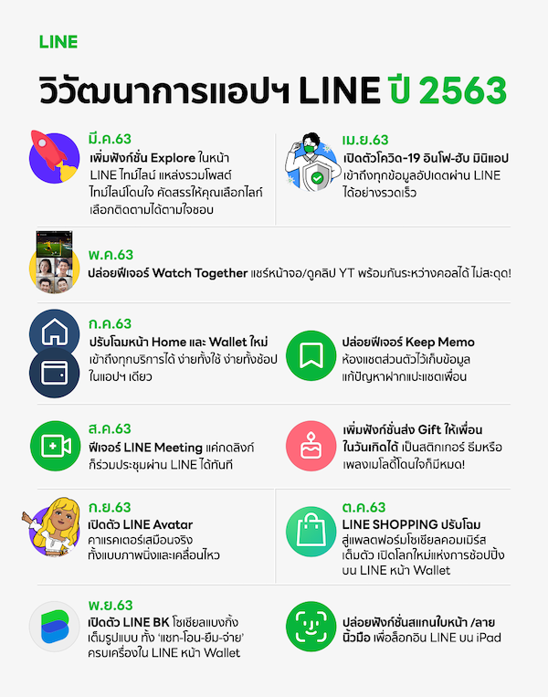 ในปี 2563 เพียงปีเดียว LINE ได้พัฒนาฟีเจอร์เพิ่มเติมใน LINE Chat เพื่อตอบโจทย์ไลฟ์สไตล์ของผู้คนมากมายที่เปลี่ยนแปลงไปตามสถานการณ์ต่างๆ ตลอดปี ไม่ว่าจะเป็นในช่วงแรกของสถานการณ์แพร่ระบาดโควิด-19 LINE ยังคงทำหน้าที่เป็นช่องทางการสื่อสาร อัพเดทข้อมูลสถานการณ์ให้คนไทยได้เป็นอย่างดีผ่าน “โควิด-19 อินโฟ ฮับ” ในรูปแบบ Mini App ในหน้า Home และบน LINE Thailand Official Account เน้นให้ผู้ใช้เข้าถึงข้อมูลโควิด-19 ได้สะดวก ครบครัน และรวดเร็ว พร้อมเป็น “นักปฏิวัติฉีกกฎเดิม” ด้วยการเปิดประสบการณ์ใหม่ในการสื่อสารช่วงกักตัว เจาะกลุ่มเป้าหมายผู้ใช้งานโซเชียลมีเดีย ด้วยการเพิ่มฟังก์ชั่น Explore ในหน้า Timeline เพื่อเป็นหน้าแสดงผลโพสต์ต่างๆ ตามความสนใจของผู้ใช้ให้เลือกกดติดตามได้ตามใจชอบ โดยไม่จำเป็นต้องเป็นเพื่อนกันใน LINE สร้างอิสระให้กับผู้ใช้ แต่ยังคงไว้ซึ่งความเป็นส่วนตัว และในเวลาต่อมา LINE ยังเพิ่มลูกเล่นความ “ทันสมัยไม่หลุดเทรนด์” ด้วย LINE Avatar ฟีเจอร์สร้างคาแรคเตอร์เสมือนจริงทั้งแบบนิ่งและเคลื่อนไหว ไว้สร้างสีสันในแชทและบนโลกโซเชียลไปกับความล้ำด้วยเทคโนโลยี AR เป็นต้น