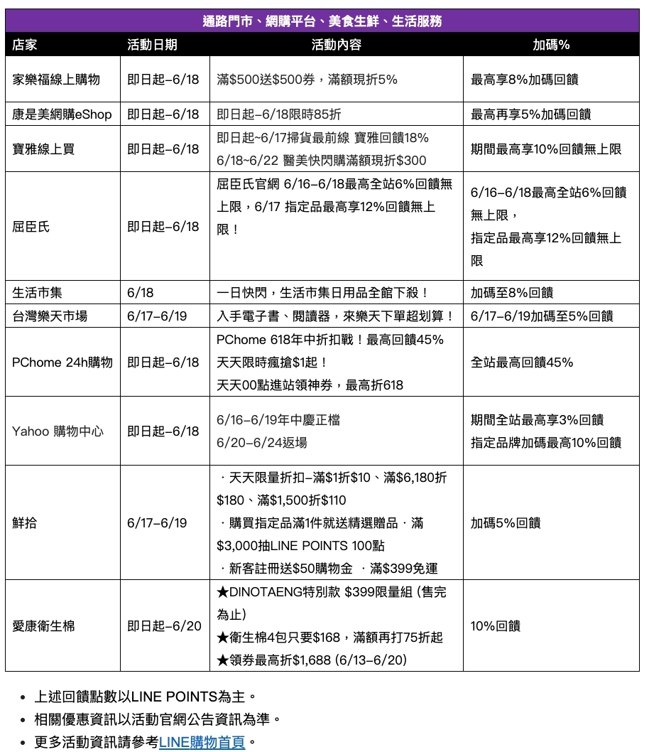 為了讓消費者以更划算的價格購入質感商品,LINE購物即日起至6月18日推出全站限時點數回饋活動,期間限定祭出高點數回饋,包括通路門市如屈臣氏提供補貨類商品最高LINE POINTS 12% 點數回饋無上限!家樂福、寶雅線上買等通路亦提供LINE POINTS 8至10%回饋。
