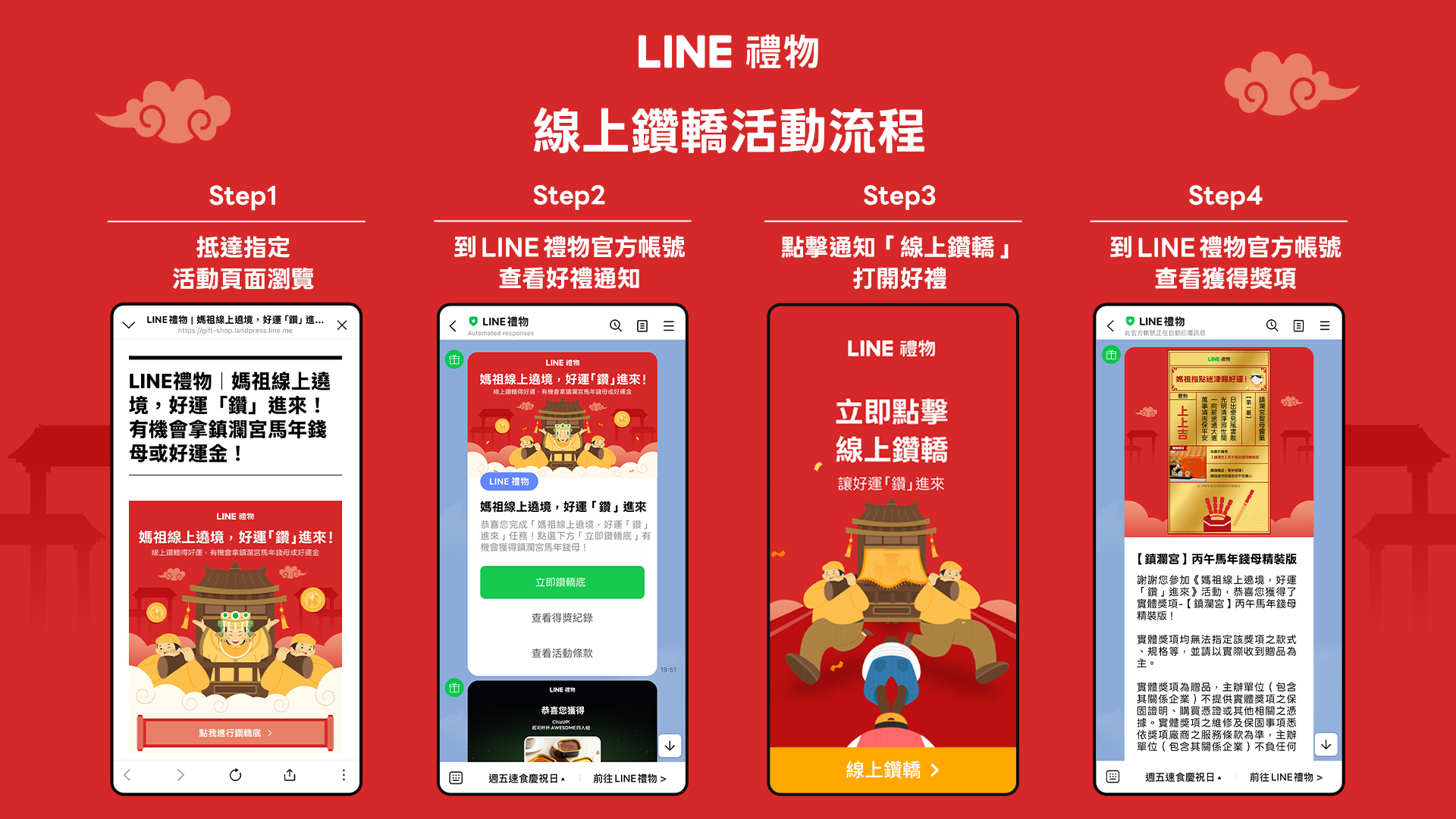 【圖3】動動手指體驗LINE禮物線上遶境鑽轎活動,有機會獲得媽祖加持的鎮瀾宮馬年錢母!