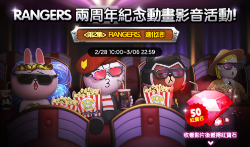 《LINE Rangers 銀河特攻隊》是一款以大家所熟知的LINE FRIENDS角色(熊大、兔兔、饅頭人等)化身為Rangers身分登場的塔防手遊。為拯救被外星人軍團綁架的莎莉,以及解救遭受外星人支配的星球,玩家可以用超過400個可愛的角色來建立自己的Rangers隊伍。自2014年2月28日遊戲開始營運以來,至今已兩周年!由於Rangers的可愛外表,以及可組成和培養戰鬥隊伍的戰略性,讓該遊戲獲得廣大玩家支持,在日本、泰國、台灣等國的App Store以及Google Play免費APP下載排行榜都曾榮登第一名寶座!。截至2016年2月為止,《LINE Rangers 銀河特攻隊》在全球累計突破3700萬次下載。為歡慶遊戲兩周年,即日起到3/6 10:59為止,玩家們透過遊戲中的連結觀賞兩周年紀念動畫影音,就可於遊戲內獲得50顆寶石的獎勵!