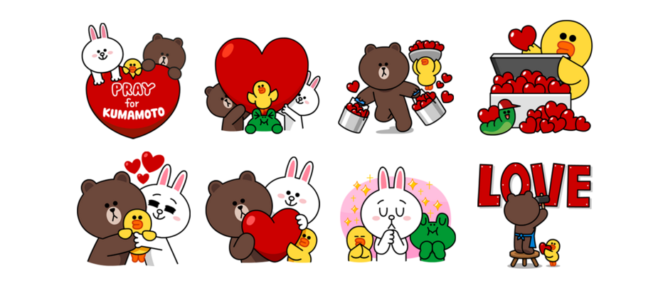 日本熊本於4月14日發生包括芮氏規模7的連續地震,對熊本以及九州島的周圍縣市造成大規模重創。對於地震受災戶與他們摯愛的親人,LINE誠心致上慰問之意,並期望受災區能盡快恢復往日榮景。為了提供受災者經濟上的協助,LINE推出「支援熊本」全球慈善貼圖,讓用戶可購買此組貼圖,來幫助熊本地區的受災戶。