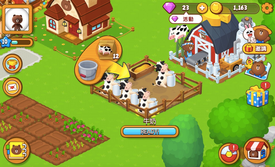 販售的對象像是饅頭人、兔兔、莎莉等其他LINE FRIENDS角色,他們會不時跑到玩家的農場排隊想購買商品,如果玩家不想賣,他們可是會失望甚至擺臭臉給你看呢!玩家也可以用「傳真訂單」的方式,看看有哪些訂單,可於生產後用貨車送出。
