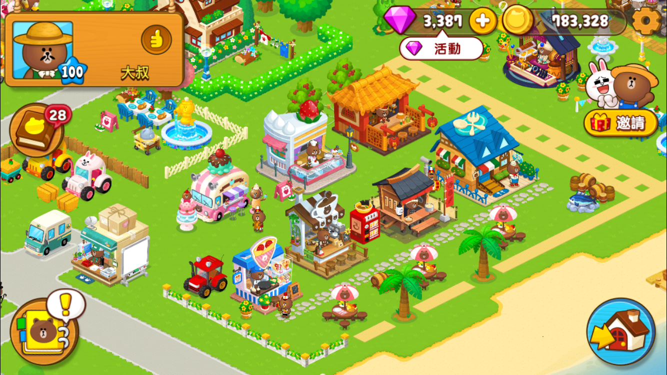 透過採收、生產、販售等行為,玩家可獲取經驗值,隨著經驗值累積,玩家的等級也會提升。等級提升後,還可以開設例如麵包店、果汁店、蛋糕店、咖啡廳、漢堡店等各種店面,甚至還可以開設礦場、增加漁獲。每個店面都會有不同造型的職人熊大坐鎮,像是在製作麵包或可麗餅時,負責該店面的職人熊大就會開始認真的工作來完成產品,超級可愛!
