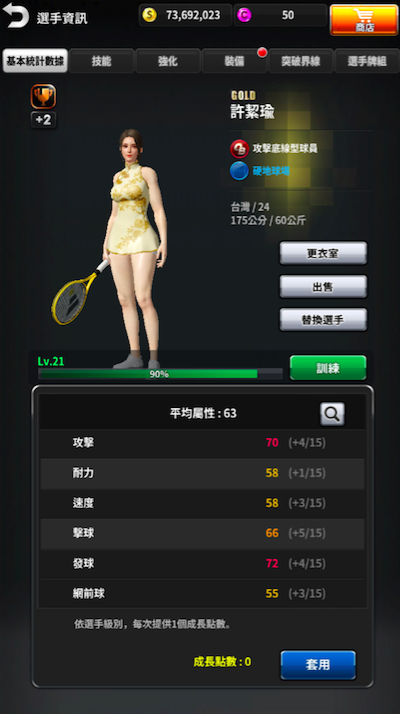 【圖】「許絜瑜」真人角色設定為「攻擊底線型球員」,擅長「硬地球場」以及國籍「台灣」