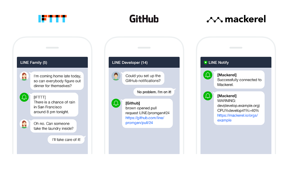 LINE Notify是一項以API技術提供的服務,可以讓外部網站的服務和應用透過LINE傳送訊息給用戶,如同LINE官方帳號訊息一樣。自2016年9月29日起,LINE Notify已上線並與網路自動回饋工具IFTTT連接,讓用戶可以從眾多服務中收到如天氣預報、擁有特定關鍵字的電子郵件或其他通知訊息,而不需要再額外開發程式。同時,LINE Notify支援軟體原始碼控管平台GitHub及伺服器監看平台Mackerel,對開發者來說相當便利。各種的通知訊息可以透過LINE Notify或服務本身的設定串接LINE帳號以發送或接收。
