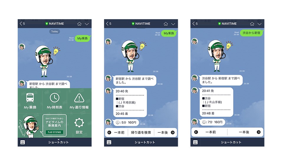 NAVITIME推出一款聊天機器人應用連結公司內部列車時間及轉乘資訊,使用戶能更輕鬆透過LINE帳號搜尋轉車路線、時刻表及列車延遲資訊。用戶不僅可以利用自然的語法進行搜尋,如簡單輸入「澀谷到新宿(Shibuya to Shinjuku)」,出發前簡單點選輸入旅程,就可獲得最即時的轉乘建議及列車延遲更新資訊。更多如列車故障和延遲資訊更新服務等新功能將於稍晚陸續推出。更多資訊請參考:http://bot.navitime.co.jp/