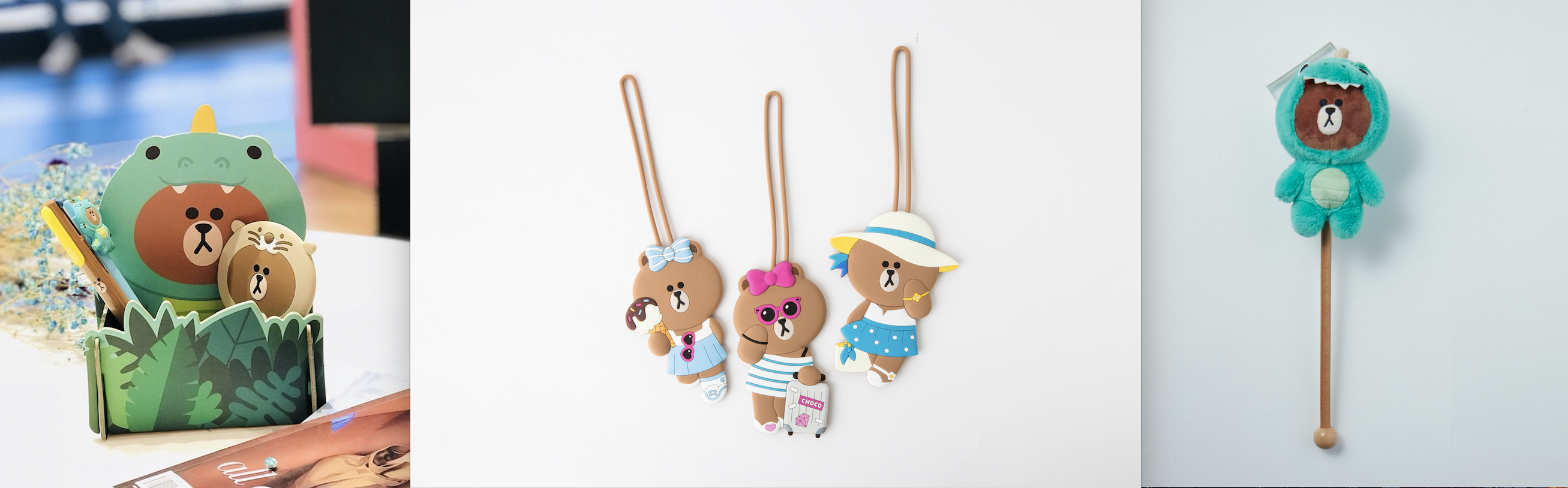 左:【圖】台灣限定角色便利收納盒。中:【圖】CHOCO 行李吊牌。右:【圖】叢林熊大搥背棒。