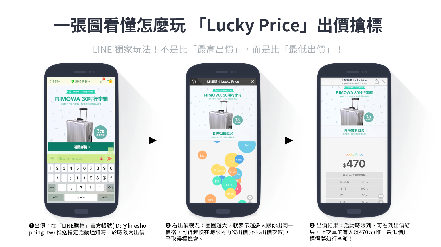 要怎麼出價呢?這四天在LINE購物的官方帳號(ID為 @lineshopping_tw)中將會推播活動通知,在LINE購物官方帳號中輸入出價金額,就完成出價了。活動當天晚上20:00就會公佈得獎者,實在非常刺激。參加出價不用錢,請務必來試試手氣,每個人都有機會將上萬好禮以超低價格帶回家!