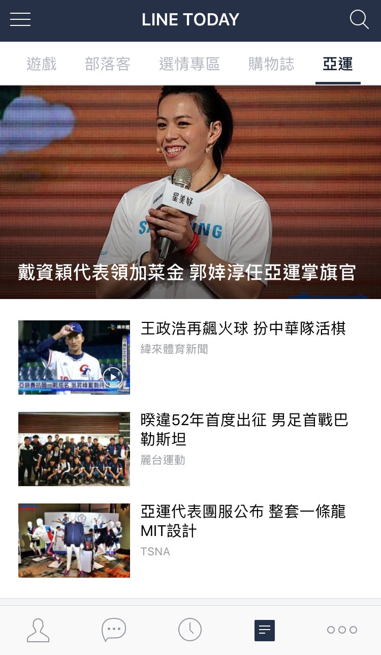 2018雅加達巨港亞運賽事期間,LINE TODAY將開闢「亞運」專區,除了賽事直播外,將提供賽事精華影音、轉播時刻表、獎牌榜、中華奪牌英雄榜、亞運最新報導、亞運花絮等豐富的亞運資訊,其中最受台灣人民關注的莫過於「中華奪牌英雄榜」。在上屆的仁川亞運,中華隊拿下10面金牌,而本屆的奪金大熱門,則是羽球世界球后-戴資穎、兩屆世大運舉重金牌-郭婞淳、標槍亞洲紀錄保持人-鄭兆村、2017世大運100公尺金牌的「台灣最速男」-楊俊瀚、網球女雙「詹家姊妹」-詹詠然、詹皓晴以及2017世大運金牌的體操「鞍馬王子」-李智凱等台灣之光,再加上一向是台灣奪牌主力的重要項目-跆拳道、射箭,以及國人關注的棒球、籃球賽事,各種賽事直播內容,LINE TODAY通通看得到,邀請大家一起為中華隊大聲喝采!