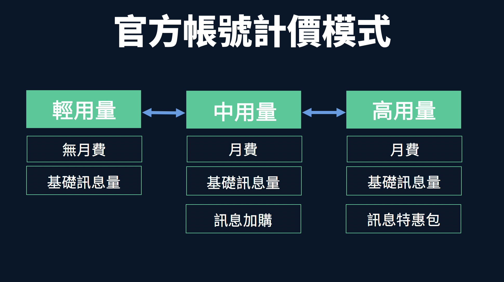 費用上,全新「官方帳號」提供更彈性、靈活的預算配比,預計推出三種月費方案,從0月費的「輕用量」,到「中用量」、「高用量」三種模式,月費將會包括基礎訊息量,費用也將改為依據受眾人數計算,讓訊息費用的計算更公平。此外,將較於目前採年約形式,未來將可以隨時調整月費組合方案,讓不同產業、淡旺季的行銷資源都能更有彈性。