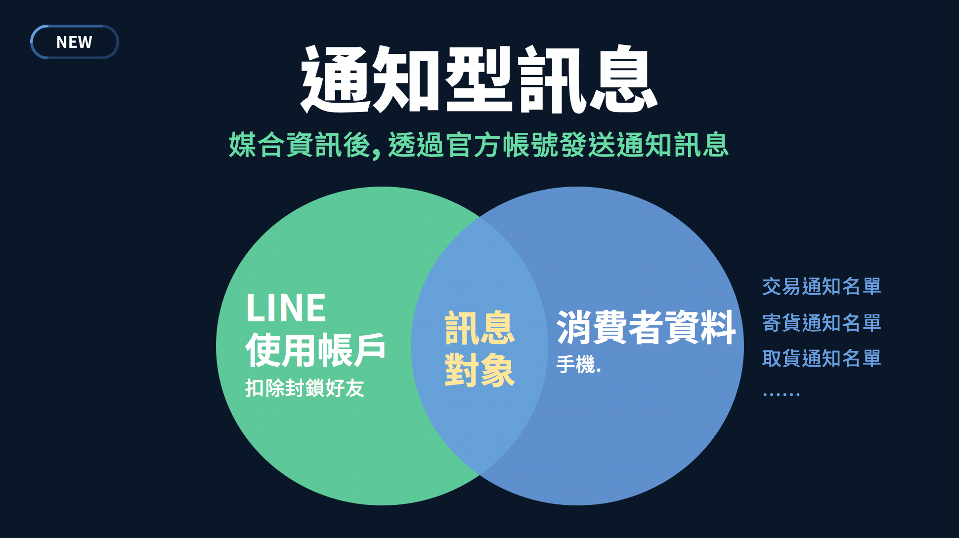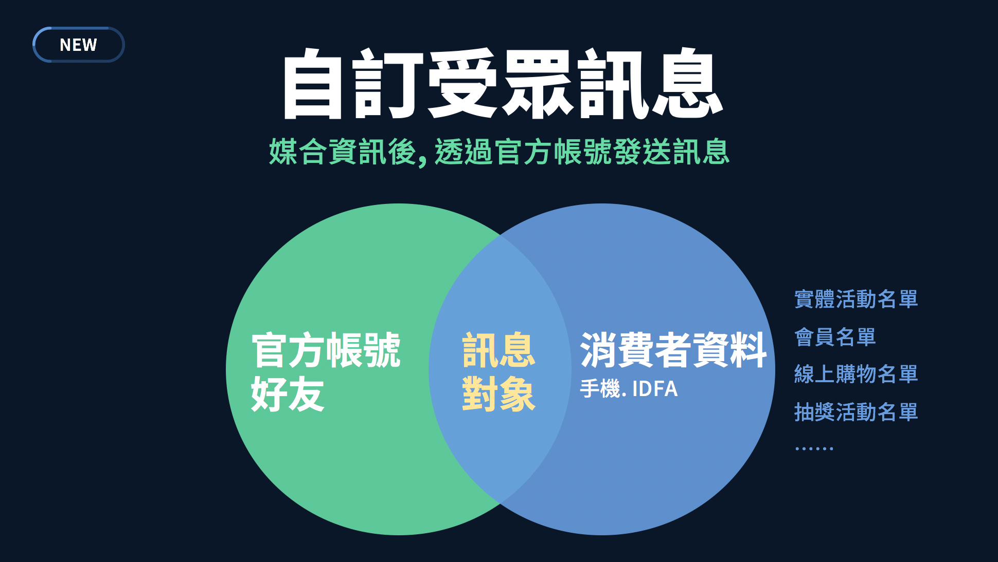 • 新服務!自訂受眾訊息(預計2018年年底上線):可以媒合官方帳號與企業主所擁有的消費者資料,進而針對特定族群發送訊息,而非一口氣通知所有官方帳號好友。對用戶來說,收到訊息是更加實用的,對企業主來說,也可以靈活地透過LINE與特定族群溝通,像是實體活動出席者、品牌會員、線上購物買家、抽獎活動名單等。