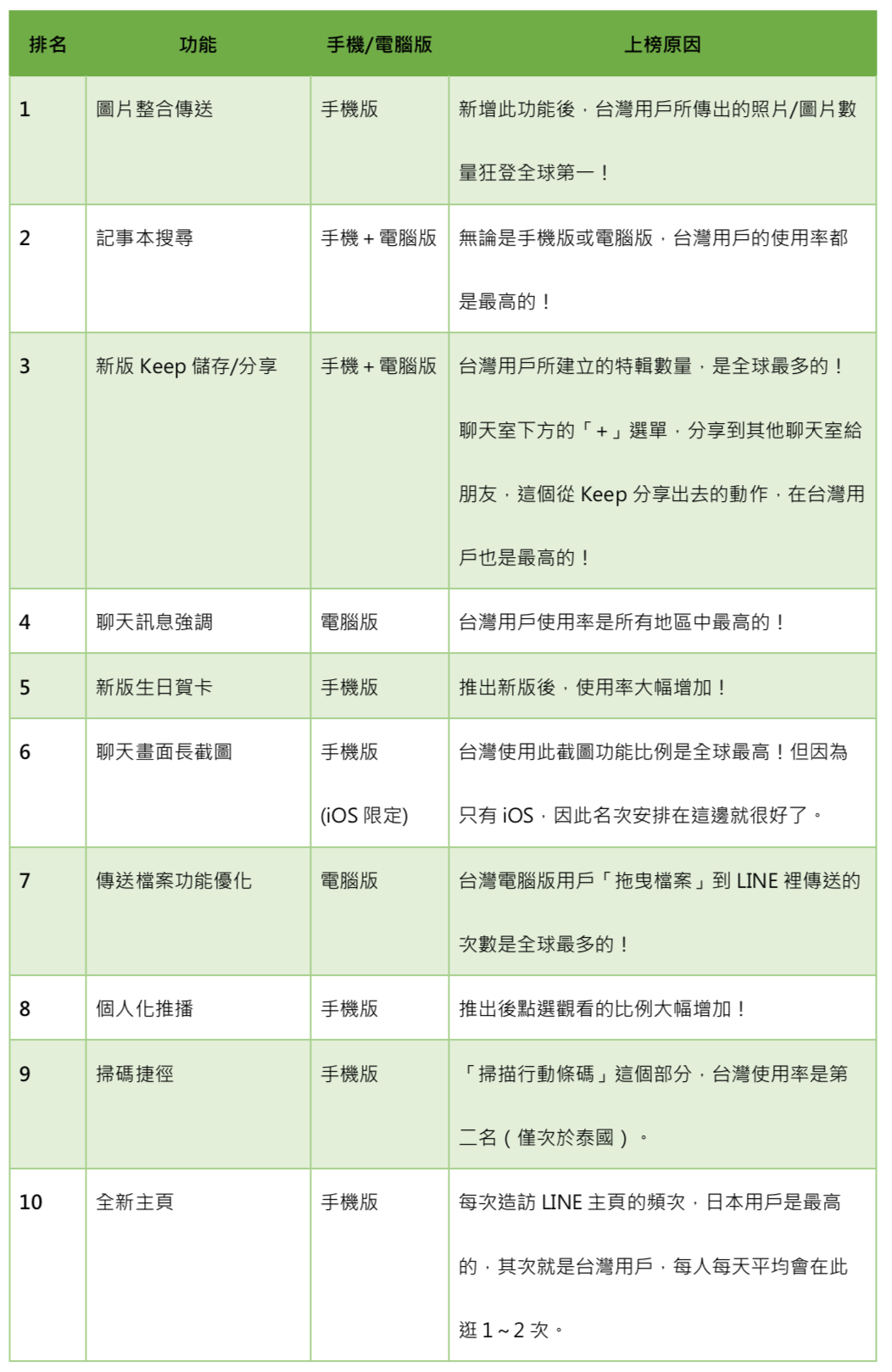 在前十名中,可以在手機與LINE電腦版跨螢使用的功能特別多,像是第二名的記事本搜尋,與第三名的新版Keep儲存/分享功能,對上班族或學生來說,很適合儲存與管理資料,存入後就可以便利地透過LINE分享。也因為LINE電腦版在台使用普及,針對LINE電腦版強化的功能,像是第四名的聊天訊息強調,與第七名的傳送檔案功能優化,使用率特別高。此外,隨著LINE中累積的內容越來越多,這次榜單中第二名的記事本搜尋功能,無論是手機版或電腦版,台灣用戶的使用率都是全球最高的!