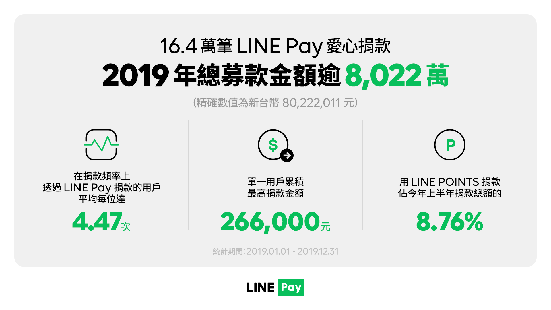 至2019年底,LINE Pay「愛心捐款」專頁共串連25個公益團體(註二)。用戶可透過平台了解弱勢族群的各種需求,並決定捐款的指定用途。公益團體也可在平台上介紹各種募款計畫,並自訂捐款金額。2019年前三大捐款受益單位依序為財團法人台灣兒童暨家庭扶助基金會、財團法人中華民國兒童福利聯盟文教基金會,與財團法人台灣世界展望會。