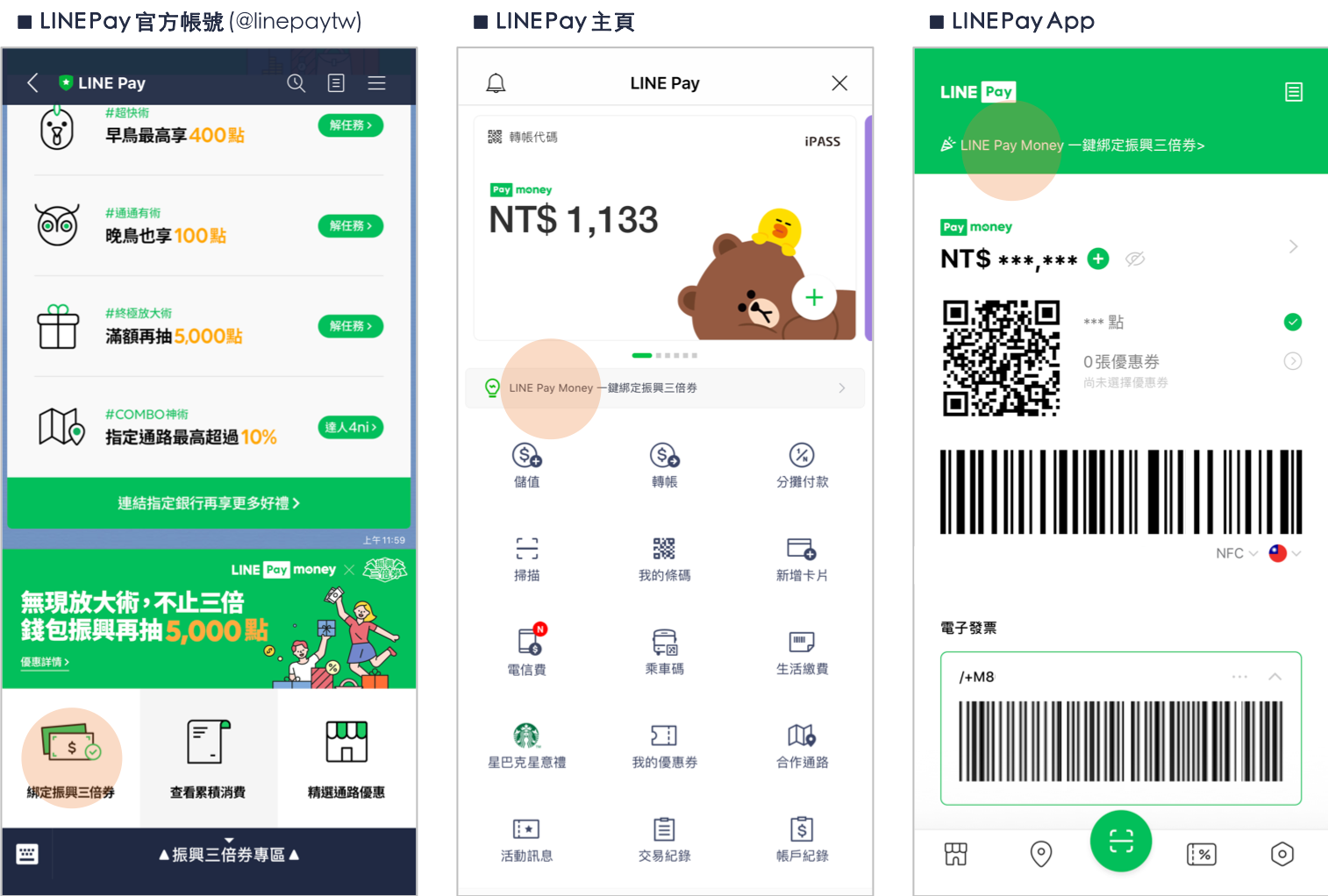 為方便用戶綁定振興三倍券,LINE Pay提供LINE Pay官方帳號(@linepaytw)、LINE Pay主頁、LINE Pay App、LINE Pay官網、一卡通官網等多種振興三倍券綁定入口供民眾使用。綁定振興三倍券於LINE Pay Money,自7月15日至12月31日期間,前10,000名累積消費滿3,000元之早鳥用戶可獲得LINE POINTS點數400點回饋,第10,001~第80,000名可獲得LINE POINTS點數200點,而第80,001名後的晚鳥用戶也都能獲得LINE POINTS點數100點,用戶只需將振興三倍券綁定於LINE Pay Money,不用擔心登錄名額限制,就能輕鬆樂享回饋!9月30日前累積消費滿5,000元的用戶,還可享 LINE POINTS 點數 5,000 點抽獎機會,詳細活動內容請見LINE Pay「活動訊息」。