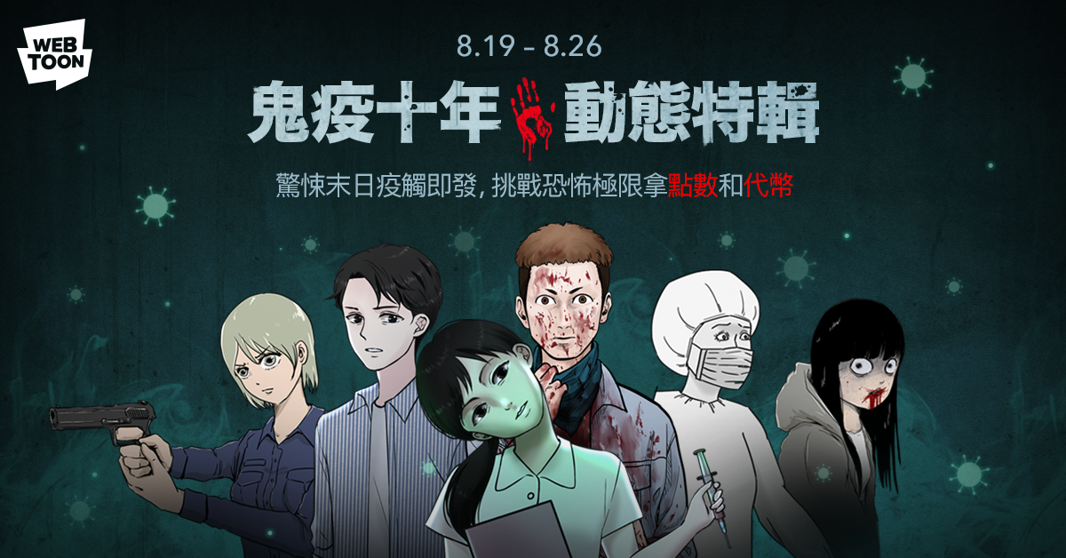 新冠肺炎病毒疫情肆虐,已改變全球生活型態,為世界帶來全方面的恐懼。LINE WEBTOON 今(19)日宣佈今年鬼月特輯以新冠肺炎病毒疫情肆虐全世界帶來的衝擊影響為概念,推出今年的鬼月驚嚇《鬼疫十年・動態特輯》,即日起至今(2020)年8月26日止,每晚10時驚夏上線,為使劇情更有張力,今年特輯邀請4位創作者構思8集故事,並加入動態效果與音效,聯手打造沉浸式恐怖體驗,期望為讀者帶來涼到心坎裡的消暑氛圍,連載期間推出限定好康活動,讀者完成指定任務就有機會獲得LINE POINTS 6點、LINE WEBTOON回饋型代幣等好禮!特輯連結