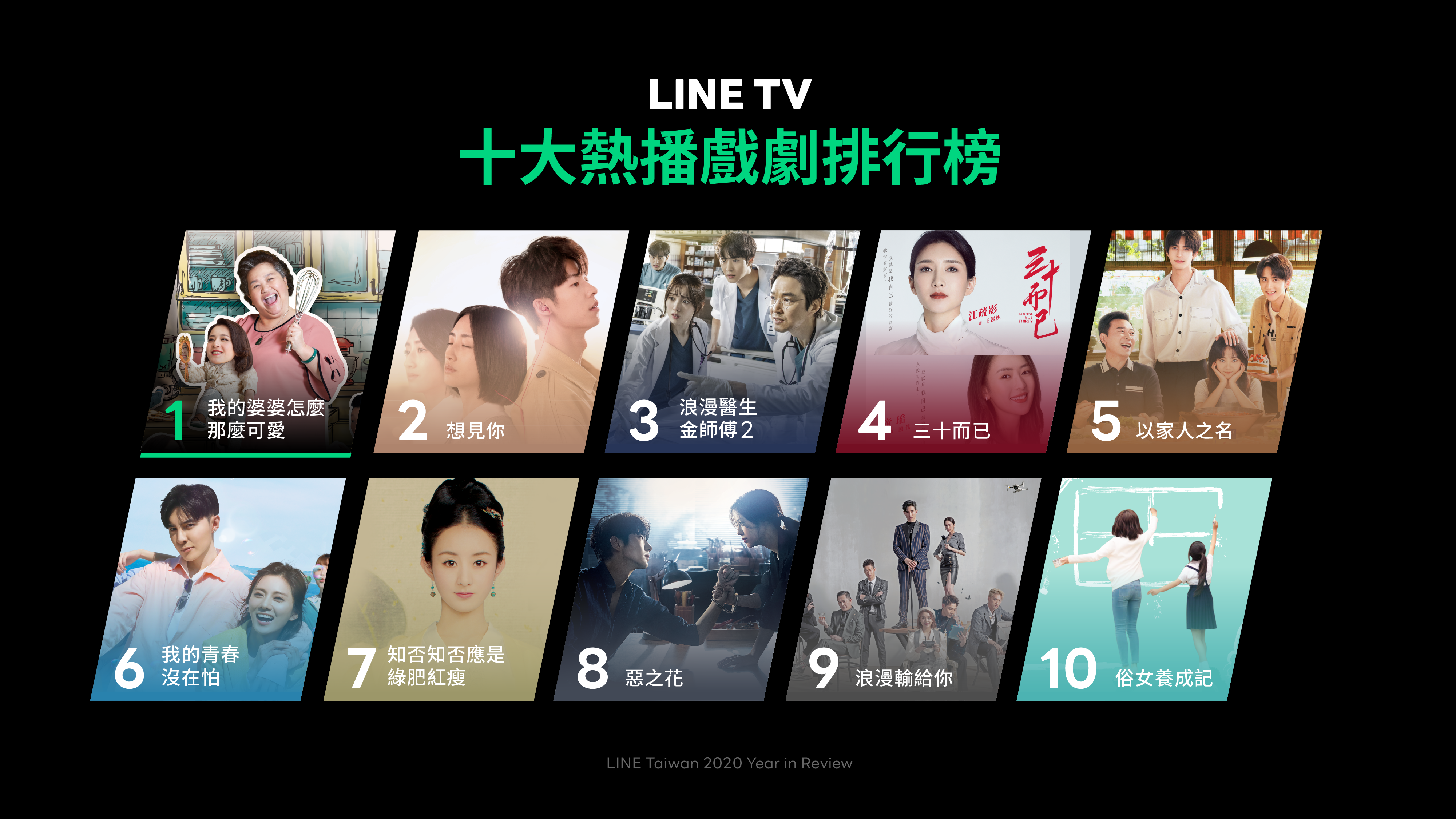 LINE台灣今 (17日) 公布2020年 LINE TV 年度十大熱播排行榜,台劇《我的婆婆怎麼那麼可愛》榮登熱播冠軍,《想見你》和《浪漫醫生金師傅2》則分別位居第二和第三。另外,更加碼分享台灣用戶三大觀劇趨勢,台劇小人物立大功、浪漫愛情劇題材最夯,多元發聲成顯學,BL劇觀看用戶最忠誠、主題訂閱需求倍增。今年因新冠肺炎疫情影響,宅經濟商機已成未來大趨勢,消費者不因時空限制,所有好吃、好看、好玩的,一樣都不想錯過!因此也造就台灣OTT線上影音串流整體流量倍增,依LINE TV整體數據顯示,相較於去年年平均流量成長近三成。而前十大熱播排行榜中,台劇佔約五成,亦顯示出LINE TV用戶對台劇的喜愛與支持。在12月歲末之際,LINE TV 也將持續推出多元優質台劇和原創節目,包含11月底剛開鏡的LINE TV原創BL浪漫喜劇《HIStory4-近距離愛上你》、原創美食交友實境節目《開著餐車交朋友》、還有昨日剛發佈的台灣在地老店創生的實境節目《今天誰來店》,期許可滿足喜愛優質台劇的用戶,在年末假期的追劇需求,精彩隨看追劇不間斷!