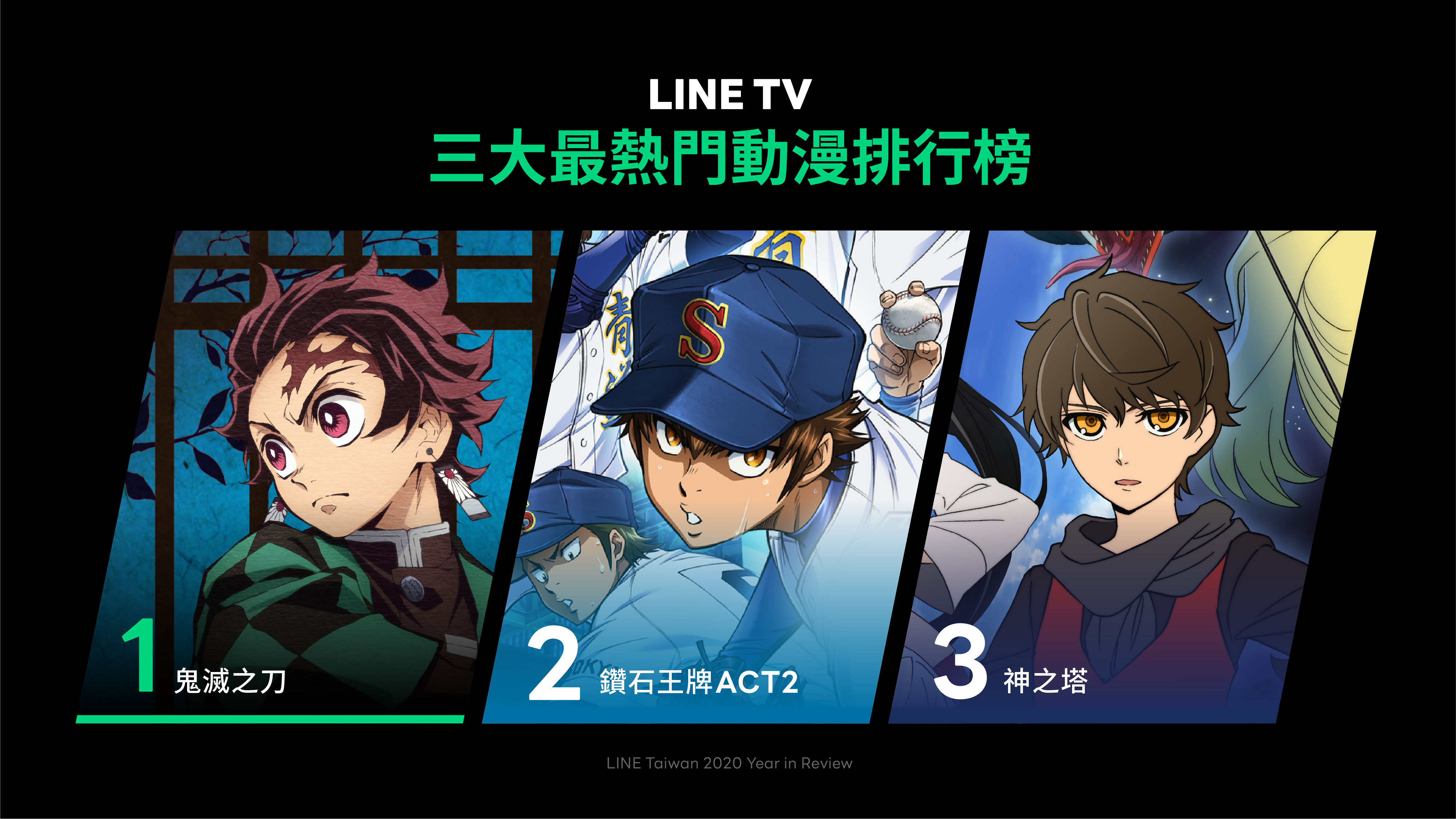 LINE TV在2020年因應疫情打亂學生學習和重創線下藝文產業活動,特別開闢了『主題訂閱』的單館專區,與空中英語教室、大家說英語合作的『語言學習館』,其中的今日免費版最受小資族和學生家長等用戶喜愛。而為振興藝文產業,特別與UDN數位劇場合作的『藝文表演館』,2020年用戶最愛觀看的表演排名前三分別是好好笑女孩的《徵婚起笑》、故事工廠的《莊子兵法》和《3個諸葛亮》。最後,今年非常值得一提的就是動漫類別排行榜,從去年開始一鳴驚人的《鬼滅之刃》熱度不減,打敗眾多新作,在動畫熱播排行榜名列前茅。居於第二位的是由寺嶋裕二創作的棒球漫畫《鑽石王牌ACT2》奪下,而由LINE Webtoon知名網漫動畫化的《神之塔》排名第三,吸引廣大LINE TV動漫迷追劇觀看。
