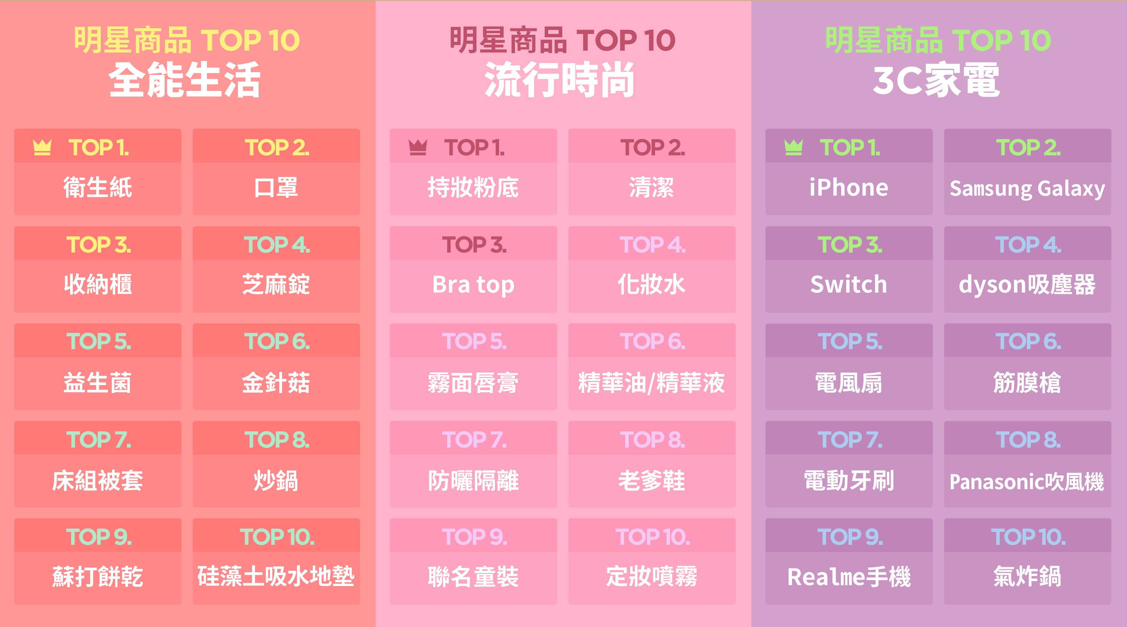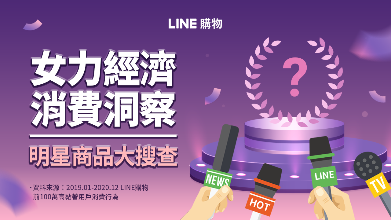 LINE購物根據用戶於站內的搜尋行為與熱賣商品,歸納出「全能生活」、「流行時尚」、「3C家電」等三大熱門類型,首度公布明星商品榜單。受到疫情影響,去年不少話題品項都與防疫或清潔高度相關,例如:衛生紙、口罩、吸塵器等,另因需長時間配戴口罩,持妝粉底、定妝噴霧等美妝品也強勢上榜!
