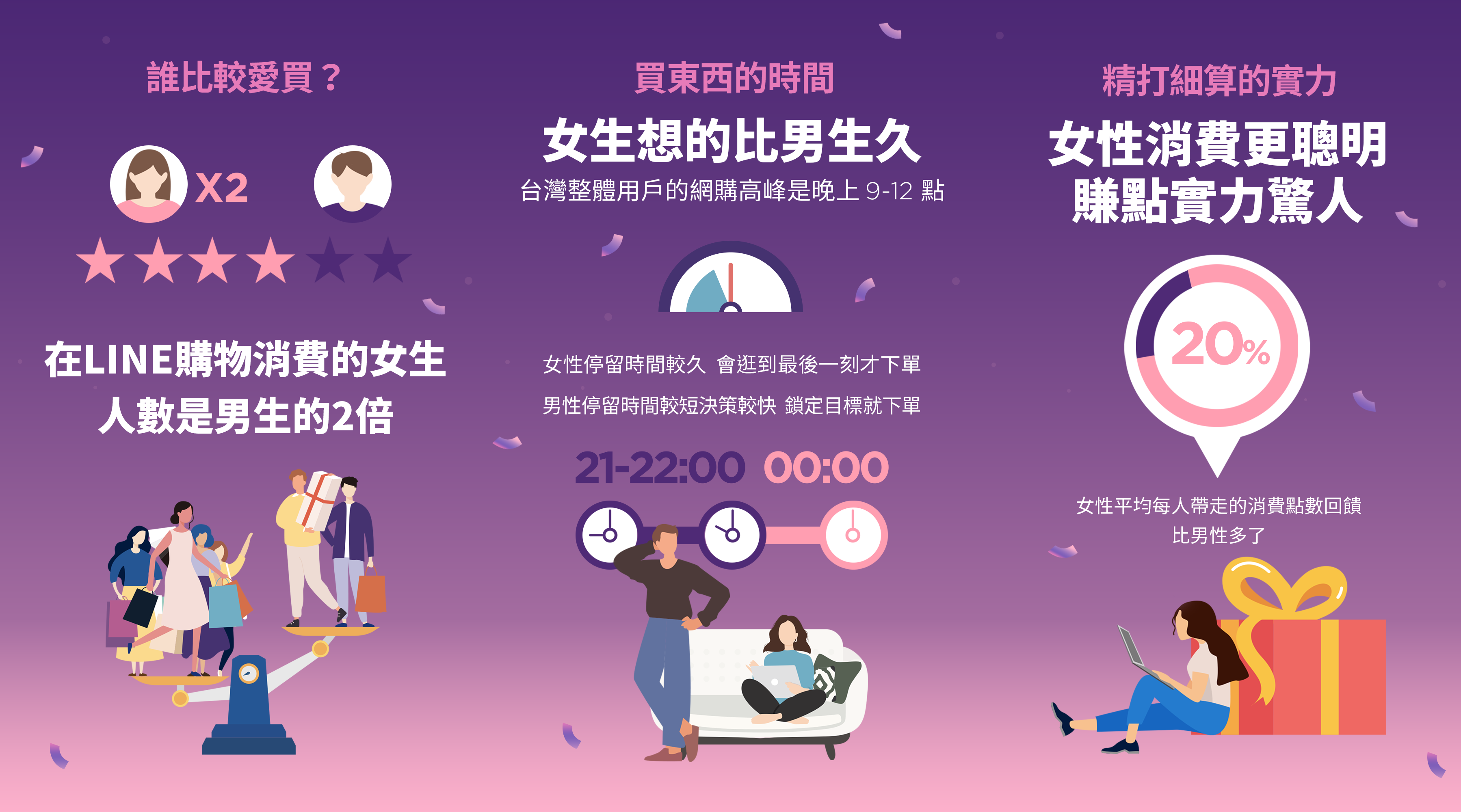 根據行政院主計總處資料[2]顯示,去(2020)年台灣女性勞動力參與率為51.41%,代表有越來越多的女性步入職場,女力經濟崛起,在LINE購物獲得印證。LINE購物觀察,用戶男女占比分別為40%與60%,且女性消費人數是男性的2倍。除整體購物人數遠超於男性之外,台灣用戶每日網購高峰為晚間9點至12點,其中,女性用戶停留時間較長,可能從9點就開始瀏覽商品,直到夜間12點才完成下單,而男性集中在晚間9點至10點,鎖定目標後就入手,且比起男性,女性用戶平均每人帶走的LINE POINTS點數回饋,多了20%,顯示出女性的賺點實力驚人外,點數回饋對女性的吸引力更大!