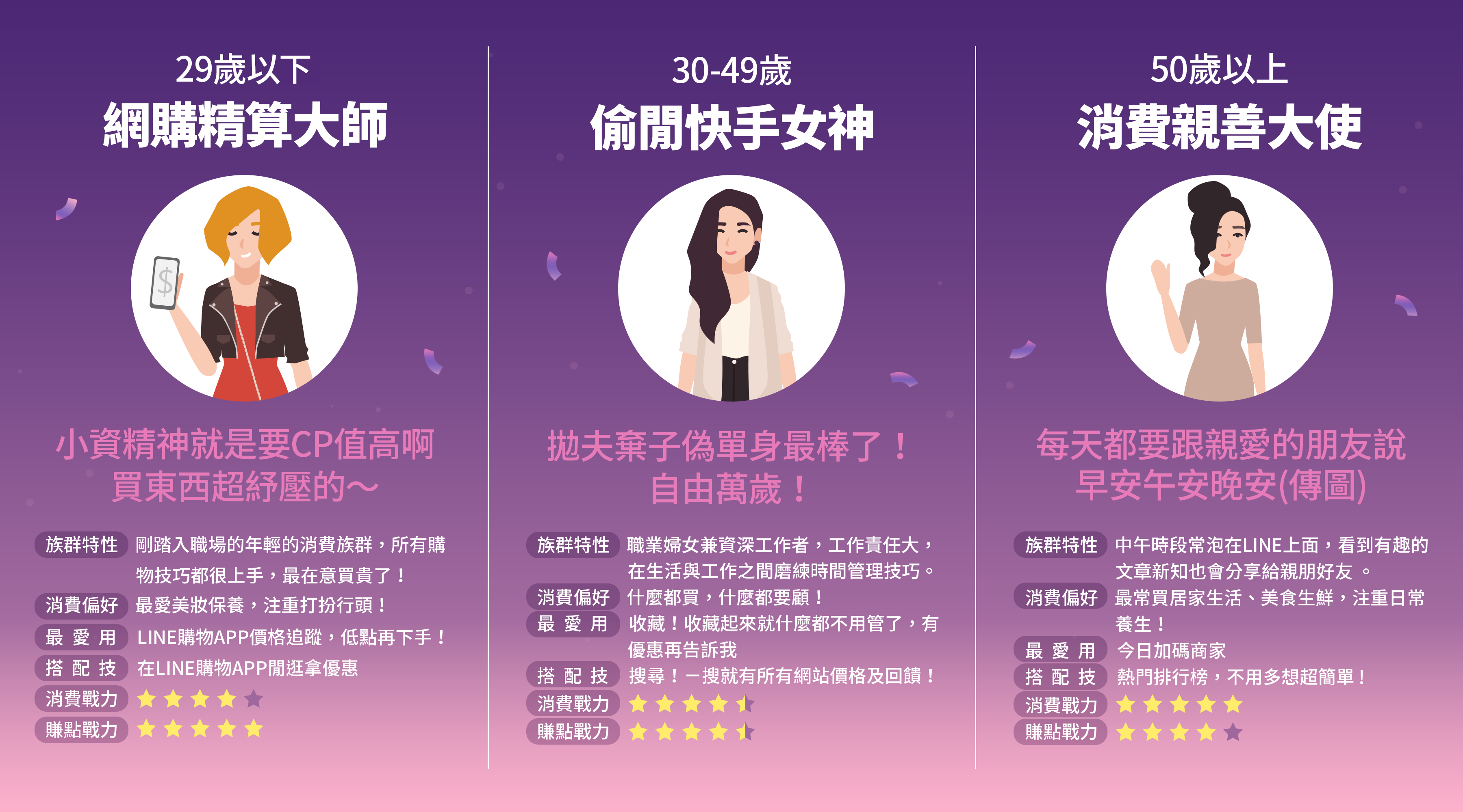 此外,不同世代的女性消費者,網購習慣也有顯著差異。50歲以上的「消費親善大使」,中午時段常泡在LINE上,主動分享有趣的文章或新知,看文章比例佔LINE購物平台用戶的一半以上!挑選商品大多從「今日加碼商家」下手,或瀏覽購物熱門排行榜,愛看熱銷品榜單的比例占LINE購物平台的52%,且過去一年每人平均在LINE購物消費近萬元,堪稱含金量相當高的族群;30至49歲的「偷閒快手女神」,多半平時會先收藏喜歡的商品,待收到降價或加碼通知時再下單,愛用收藏功能之比例占全站用戶的37%,也透過搜尋功能掌握價格差異與回饋高低,愛用搜尋的比例超過全站用戶的4成,更運用零碎時間網購,下單次數最多、平均每月都會在LINE購物上消費;29歲以下的「網購精算大師」使用LINE購物APP下單的比例為36%,並經常使用價格追蹤功能,或參加APP限定活動領取優惠,購物前偏好參考達人開箱與商品推薦的相關文章,以充分瞭解商品資訊,同時也是各族群中的賺點冠軍,去年獲得LINE POINTS點數回饋總數較前一年成長近5成!