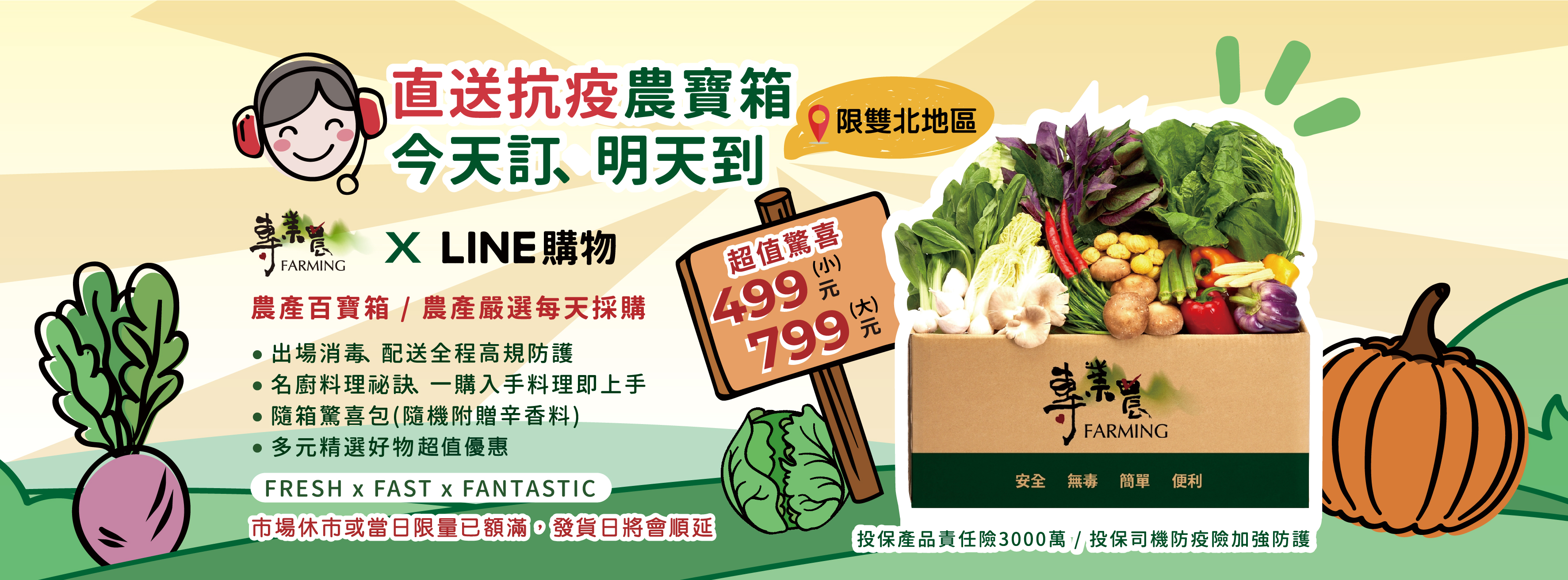 為提供民眾最快速、安全的產品,並協助解決農產品的銷售困境,LINE購物特別與夥伴「專業農」農產品銷售平台合作,由專業農團隊所提供的「農產百寶箱」,產品皆為產地檢驗合格、並於包裝前經過紫外線噴槍消毒的安心食品。由於線上購物需求增加,亦使物流量爆增,產品到貨時間變得難以掌控,為此 LINE購物協助夥伴串連 LINE TAXI運送,雙北用戶下單成功後、隔日便能收到「農產百寶箱」!