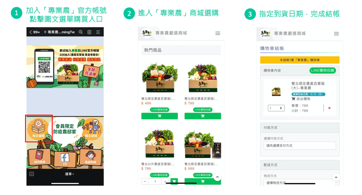 【圖3】用戶 透過「專業農」官方帳號收單系統下訂,即可便利、快速的訂購「農產百寶箱」。