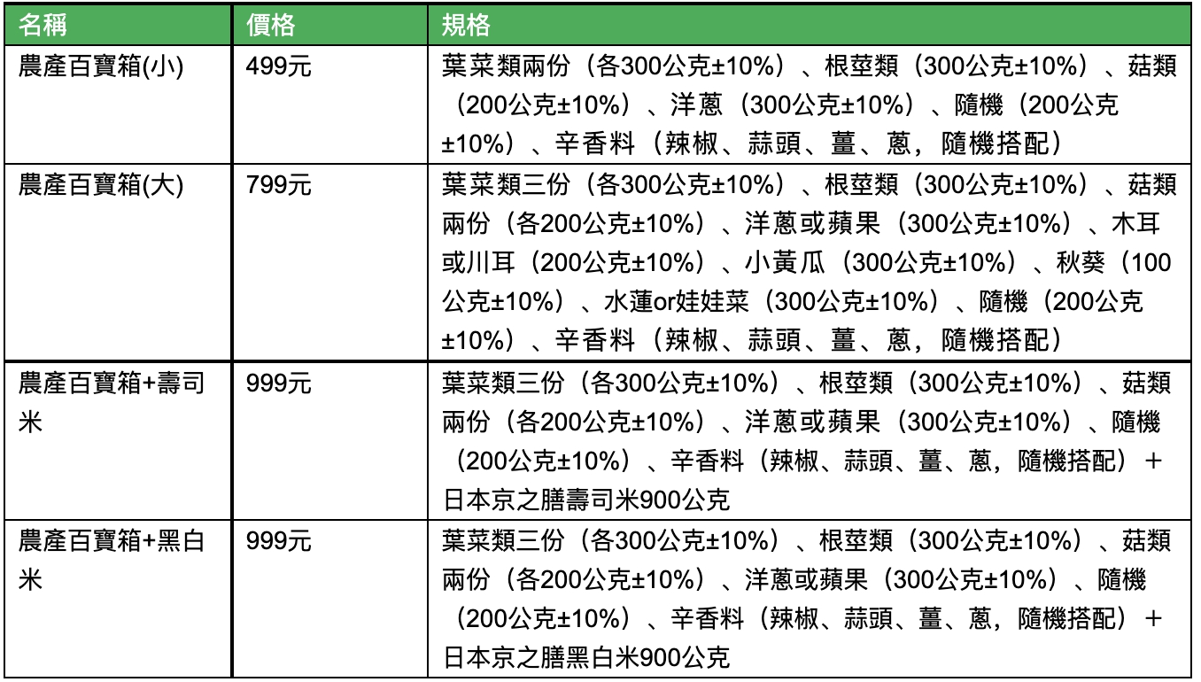 LINE購物夥伴「專業農」推出之農產百寶箱規格如下: