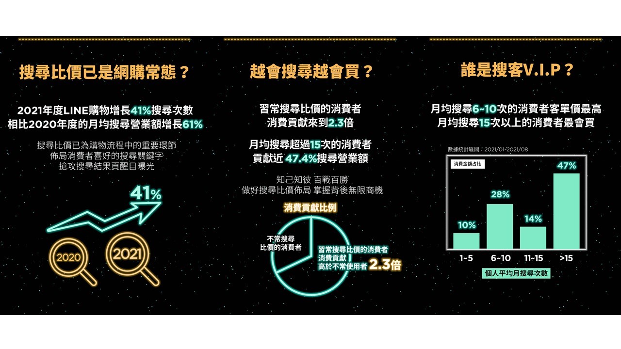 近期疫情趨於緩和,然已深化民眾線上購物的消費習慣,LINE購物觀察,相較三級警戒前,民眾搜尋次數成長超過4成,營業額更創造近一倍爆發性成長,「搜尋比價」已經深化為消費者網購前的常態。根據LINE購物今(2021)年下半年最新數據統計,透過LINE購物平台搜尋比價的用戶,後續下單的轉換率高達20%,代表每5個人中就有1人完成結帳,顯示出LINE購物所提供的搜尋比價服務使用信賴度高,LINE購物將此族群定義為「搜客」,適逢一年一度電商雙11大檔來臨,為搶「搜客經濟」,提供最佳的導購搜尋體驗,除了貼心優化多項搜尋功能外,更祭出LINE POINTS回饋超過 1億點的優惠好康活動,期望他們「先LINE購物 再購物」掀低價、搶好禮!一同解析雙11搜尋比價趨勢洞察(連結)