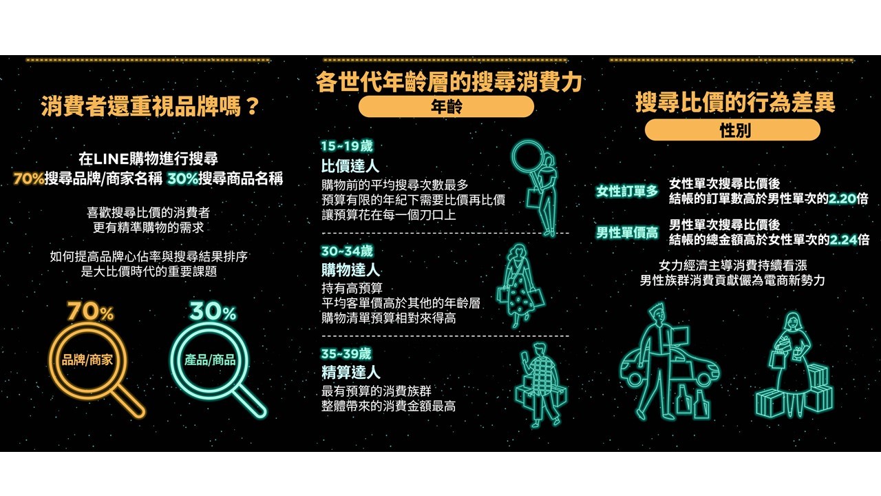 依據LINE購物觀察,15至19歲的「比價達人」在預算相對有限的情況下,往往花費較多的時間搜尋商品及比價,確保筆筆消費都是最優惠;30至34歲的「購物達人」雖然搜尋次數低,其平均客單價則是各年齡層中最高的,普遍對於單價較高的商品擁有更高的接受度;至於35至39歲的「精算達人」不僅預算充足且購物意願高,整體帶來的消費貢獻最為可觀。
