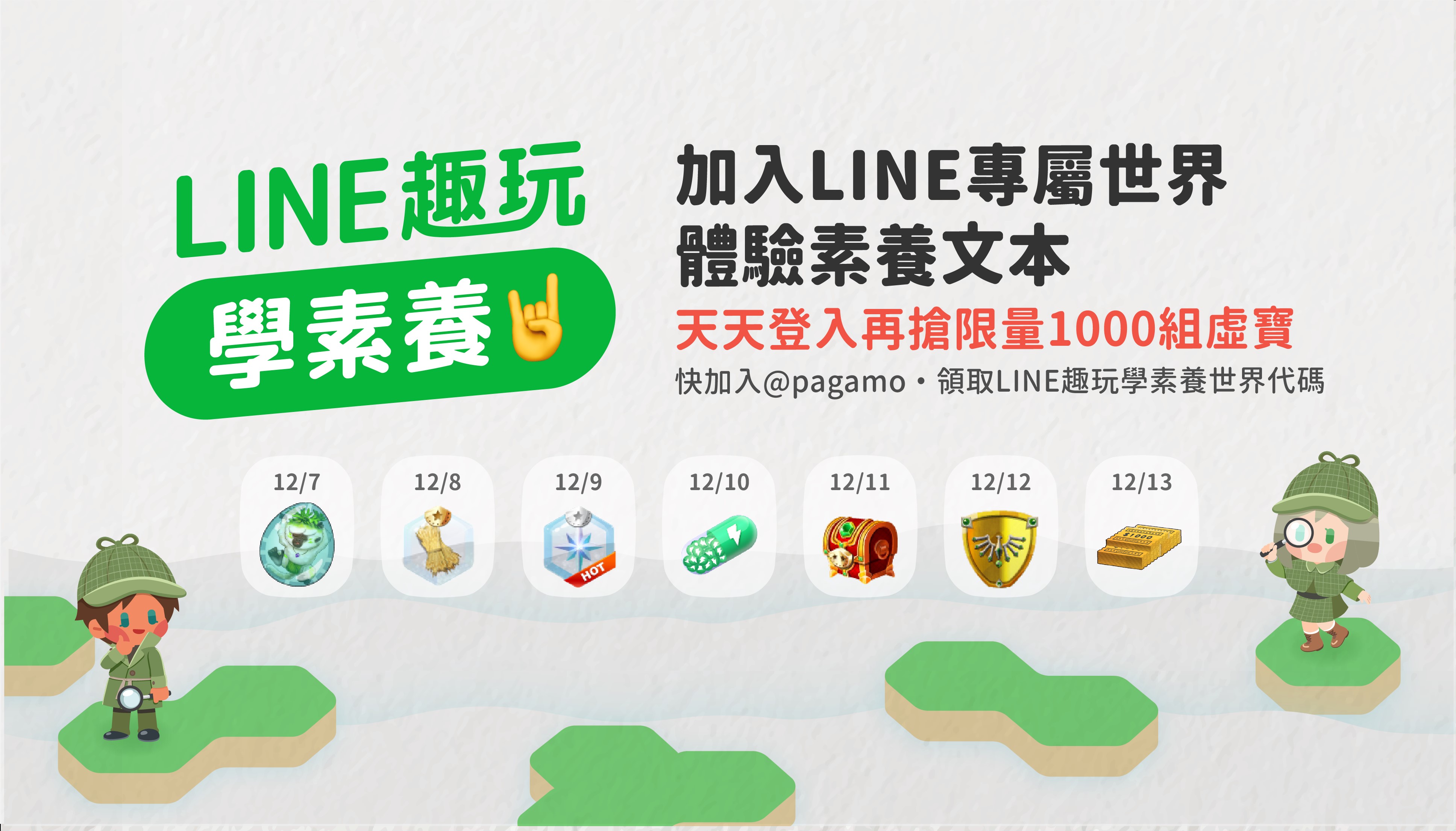 全新專屬世界【LINE趣玩學素養】將於12月7日正式上線,更推出歡慶開幕活動,即日起至12月13日為期一週,天天登入再搶限量1000組虛寶,快加入「PaGamO打Game學」的官方帳號(搜尋LINE ID: @pagamo),領取LINE趣玩學素養世界代碼,期待兒少學童在各個面向都能收穫滿滿;假消息退散再加碼,12月22日至12月28日止,凡加入PaGamO官方帳號,連續答對三題LINE媒體素養題目,即可抽精美好禮,鼓勵學生們邀請好友相揪學習趣。