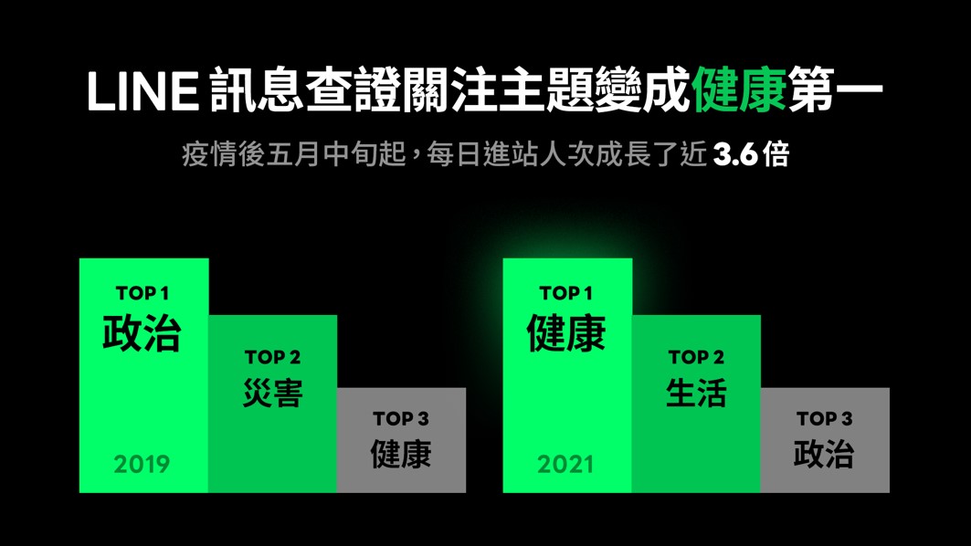 LINE台灣 在2021年第一季再次針對台灣民眾進行「可疑訊息辨別與查證量化分析」,調查[1]指出,1,000名受訪者中,51%表示過去6個月有收到或看過網路上的可疑訊息,較 2019年(46%) 顯著上升。其中約超過41%有進一步查證並獲得正確資訊 (從2019年的37%成長到2021年的41%)。且最後仍約有1/4消費者會轉傳查證後的正確訊息。而用戶最常收到且最關注的可疑訊息主題轉換成『健康』排名第一,其次分別為『生活』和『政治』,而前十大闢謠查核文中– 以2021年8月為例,前十名中即有五篇是和健康主題、和疫情議題有關。