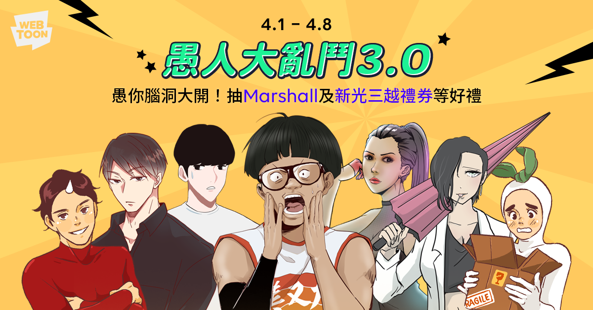 LINE WEBTOON每年為了愚人節特輯精心籌劃博君一笑的幽默惡搞專題,今年除了惡搞主題,為提供讀者更豐富、精彩的大亂鬥場景,重啟2017、2018年的愚人節特輯主題,推出《愚人大亂鬥3.0》,將7部平台上的熱門作品的角色隨機組合編織出7段全新故事,透過不同作品的角色首度相遇,不僅激盪出新的火花,更將道出眾角色深藏在心、不為人知的一面!LINE WEBTOON表示,本次特輯邀請了7位台灣創作者參與,每位創作者的作品中將會加入其他作品的角色亂入客串,透過不設限的全新創意詮釋,帶出原作品顛覆想像的全新面貌,讓讀者盡享眼光繚亂、更有趣的閱讀體驗。