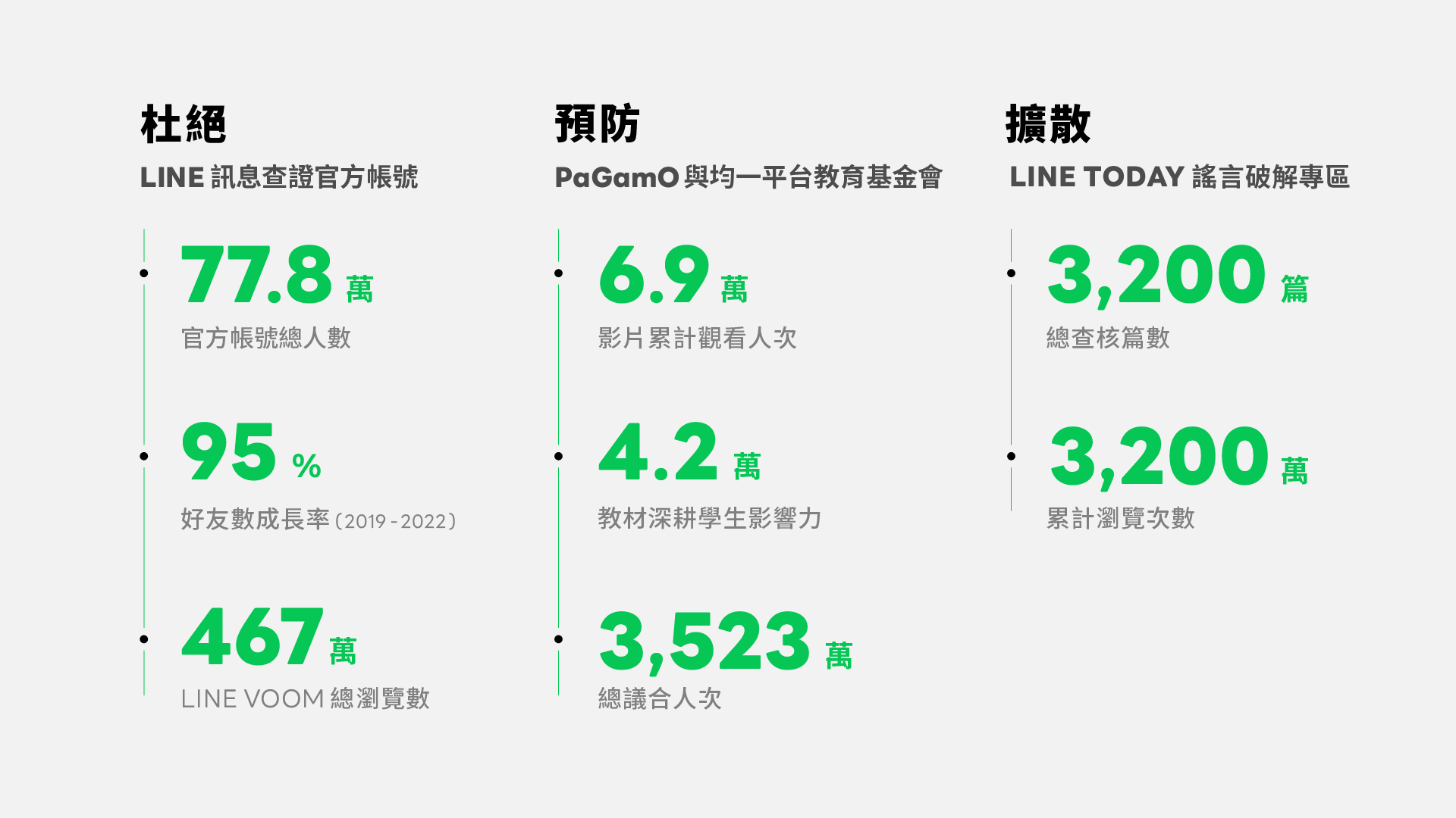 LINE數位當責計畫致力於從「杜絕」、「預防」、「擴散」三大面向,防範錯假訊息流竄,培養用戶查證可疑訊息的習慣,和積極分享查核結果的傳散。以「杜絕」面向而言,LINE訊息查證官方帳號已累積訂閱人數近78萬,相較2019年好友數成長95%,分享至LINE VOOM上累計超過90則貼文,總瀏覽人次達467 萬。「預防」面向則是聚焦與均一教育平台合作推出「科學媒體素養」課程,影片總觀看人次達6.9萬,教材使用率更深耕國中小校園,達4.2萬人次皆應用此課程教材進行科學媒體素養之學習。2021年更攜手PaGamO遊戲學習平台推出「真假糾察隊」官方任務和LINE『趣玩學素養』的獨立專屬世界,從小培養孩童對訊息的數位思辨能力和獨立思考,化被動為主動,打擊戰勝錯假訊息,在預防層面,三年總議和人次高達3,523萬;最後「擴散」面向旨在LINE TODAY 謠言破解專區的顯著成效,三年累計查核文約共3,200篇,瀏覽次數高達3,200萬,針對不實可疑訊息,LINE落實在地永續發展之責,守護全民安心數位環境。