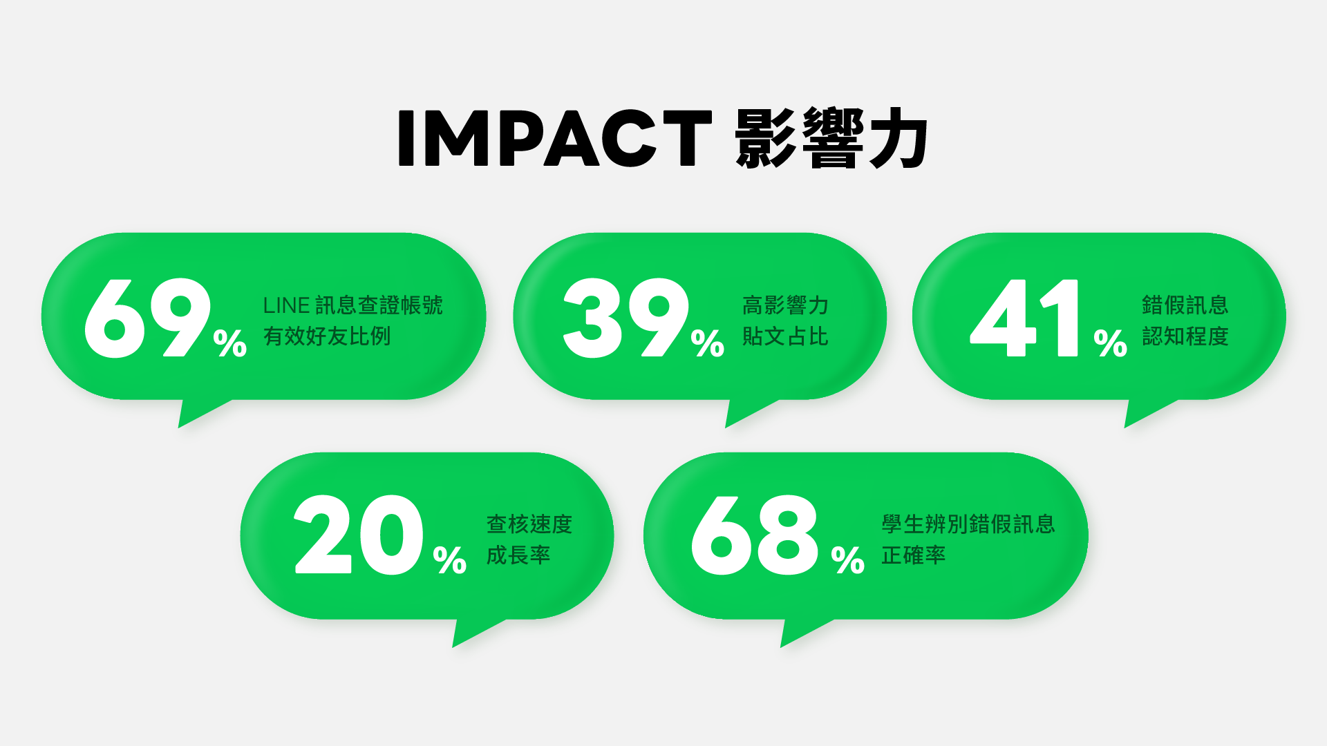根據LINE數位當責計畫之影響力報告指出, LINE 訊息查證官方帳號好友數已累計近78萬,顯示用戶數位思辨力提升,打擊錯假訊息意識抬頭。為了擴大影響力和好友互動,LINE 訊息查證也會將重要澄清訊息分享到LINE VOOM社群貼文,其中39%的貼文高於平均瀏覽率,代表用戶除自身主動查證外,更樂於將正確查核文分享給親朋好友。三年以來,根據Ipsos 2021「可疑訊息辨別與查證量化分析」指出,用戶錯假訊息認知程度從原本2019年的37%提升至41%,表示大眾對於網路可疑訊息的思辨能力有所增進,接收可疑訊息後更逐漸養成進一步查證的良好習慣,獲得正確資訊後亦會分享傳散;相關查核單位的查核速度更是成長20%,有效抑止錯假資訊和線上謠言二次傳播可能。2021年 LINE 開始攜手 PaGamO 遊戲學習平台推出「真假糾察隊」官方任務,讓孩童辨別錯假訊息正確率達到將近7成,透過互動式生活問答題,從小培養國中小學生利用訊息查證快速辨別錯假資訊的能力。